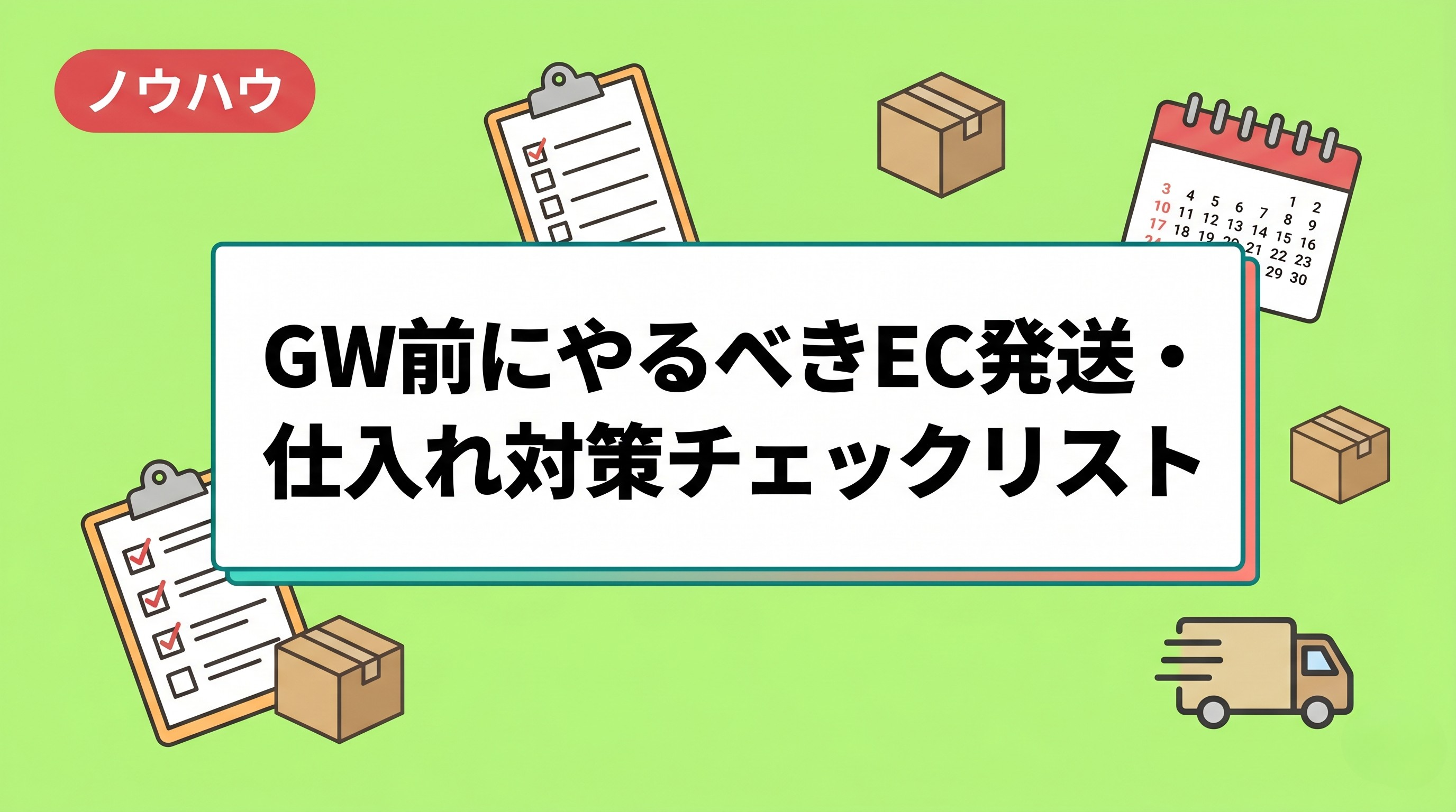 いかがでしたでしょうか。2026年GWまで残り12日。まず今週中に15項目のチェックリストをひと通り確認し、①発送段取り、②在庫の事前確保、③顧客への告知の3軸を整えておきましょう。
