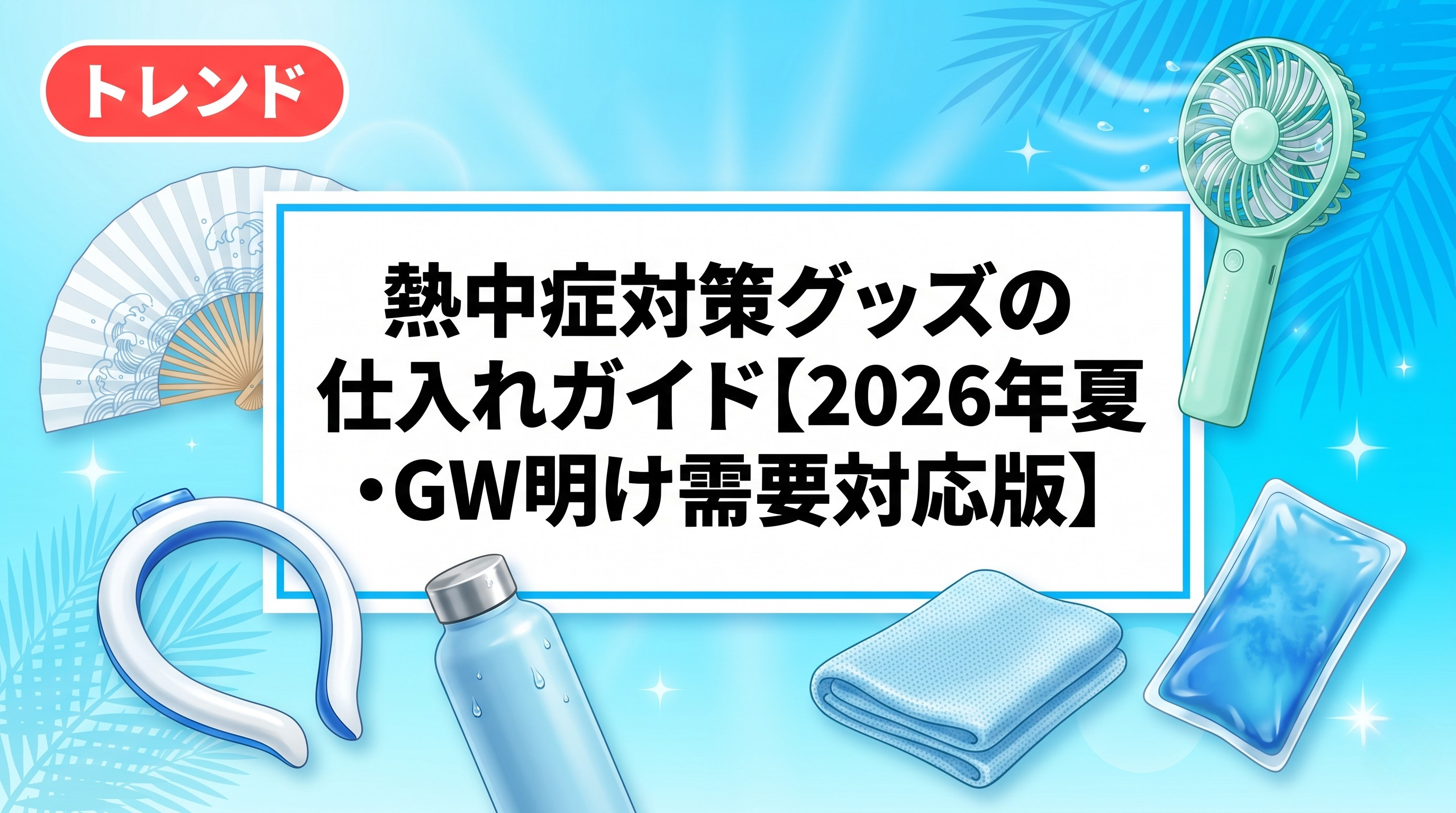 2026年の夏商戦において、熱中症対策グッズは職場での対策強化を背景にした法人需要と個人需要の両方が重なる、安定成長カテゴリです。仕入れの黄金期は5月上旬〜中旬。梅雨明け以降は在庫が薄くなり価格も上昇するため、早めに動くことが利益率の向上につながります。GW中は多くのサプライヤーが休業するため、GW明けに即発注できるよう、今から仕入れ先と商材を絞り込んでおきましょう。