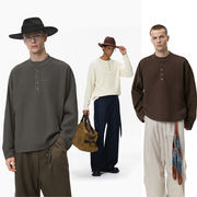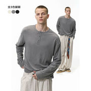 メンズ ヘンリーネック長袖Tシャツ 秋新作 無地トップス オールドマネー風 リラックスカジュアル★全3色