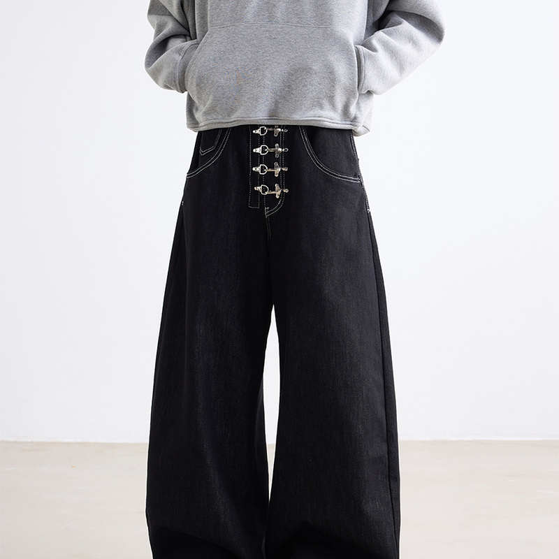 メンズデニム 飛行機バックルデザイン ワイドストレート 高街系フレア感ロング