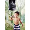 持ち運べるポータブルシャワー災害時の水浴び用として、キャンプでも使用できます。シャワーヘッドはストッパー付き。太陽光を吸収しやすい黒色なので、放置して水を温めやすい。フック付きロープでいろいろなところに引っ掛けて使用できます。