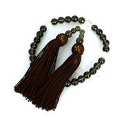 【仕様】<玉の直径>主珠:10mm 親玉:12mm 二天:8mm <玉数>27玉(主珠)<房>頭付き撚房:人絹【特徴】一般的な片手念珠(略式念珠)です。宗派を問わずお使いいただけます。【豆知識】元々は仏教の礼拝具として発展し、現在もその意味合いが強いですが、その一方で最近はファッションとしても使われることが多くなりました。持っているだけで功徳がある、お守りとなると言われ、略式念珠の他、「腕輪念珠」と呼ばれるブレスレットタイプのものもあります。本式の念珠は108玉あり、宗派によって形状や扱い方が異なります。片手念珠は宗派は問いませんが、小さめの玉のものは女性が、大きめの玉のものは男性が使うことが多いです。【パワーストーン】タイガーアイ:茶色の地に、金色の光がキラキラ光るのが特徴です。金運、財運、仕事運のアップのお守りに。またこの光は、「次の次元への扉」を指し示し、新たなことへの挑戦へのステップアップを導くとされます。特に事業に関する事柄には強力にサポートすると言われます。営業マン、新規プロジェクトの立ち上げ、就職、受験などのお守りにどうぞ。