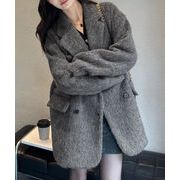 ・品よく着映える大きめテーラー衿にダブル釦のデザインがファッショナブル。