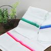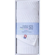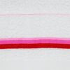 平地部分との境界に鮮やかな色合いの太めのライン、そして生地部分には細めのボーダーをデザインした平地付きのオーソドックスな白タオルです。